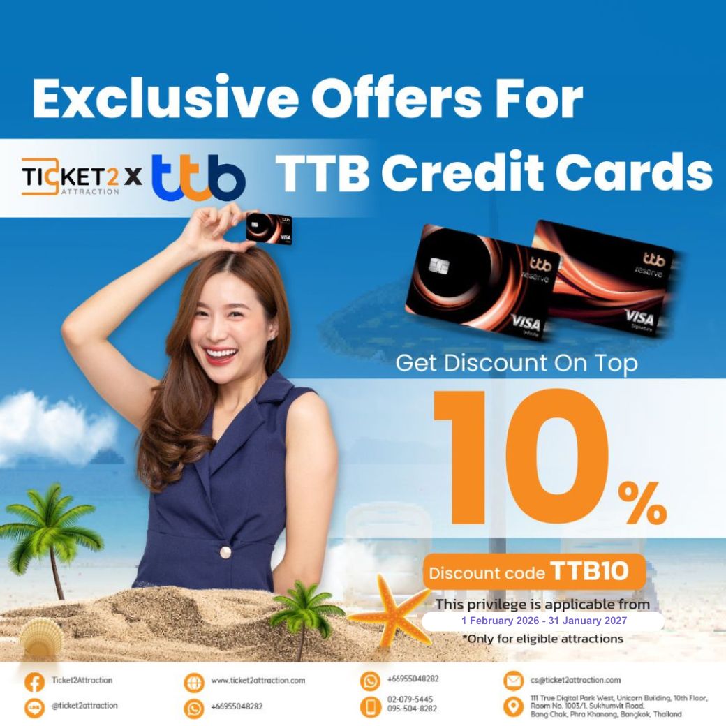 Special privilege for ttb credit card holders! Get 10% discount on top of tickets to Thailand's attractions on Ticket2Attraction.