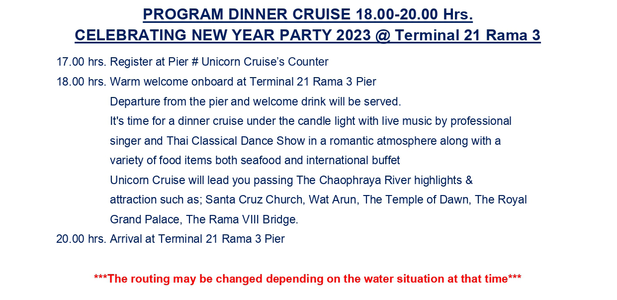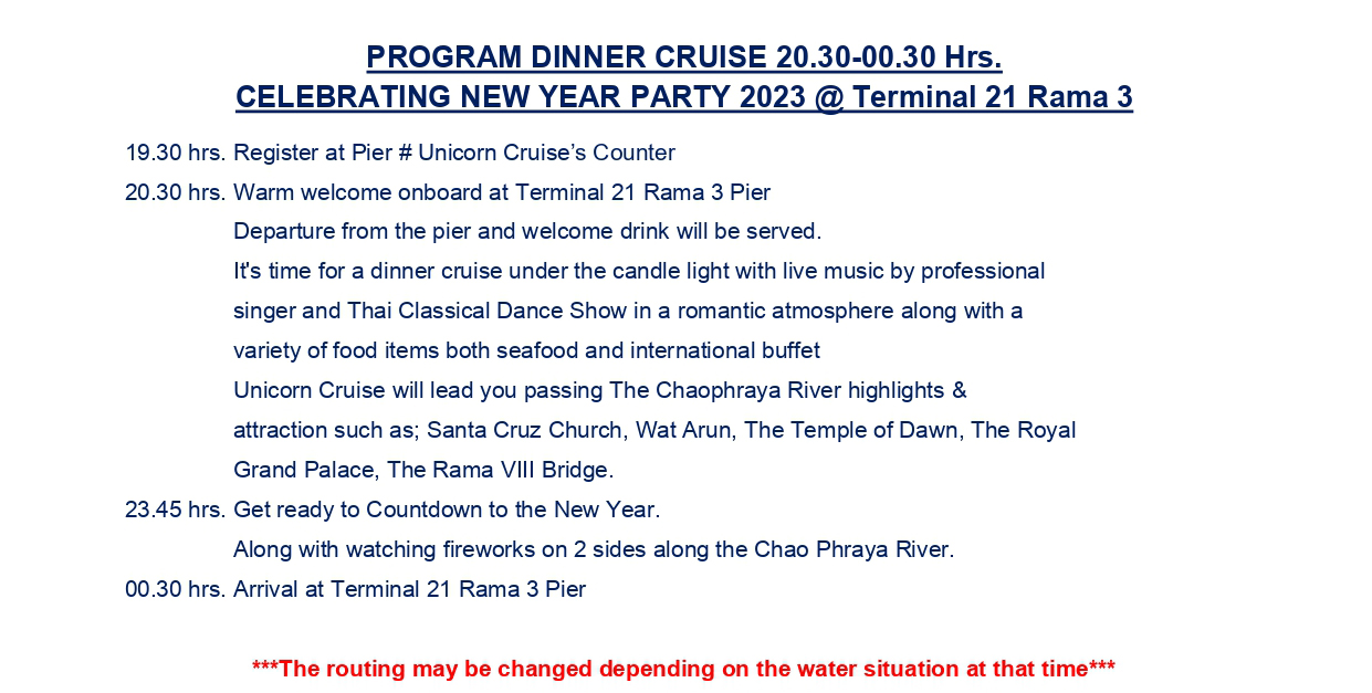 - Celebrate the New Year's Eve countdown for 2026 in Bangkok aboard the Unicorn Cruise, Bangkok's newest addition to the Chao Phraya River fleet. On this special program, the cruise will depart from Terminal 21 Rama 3 shopping mall.