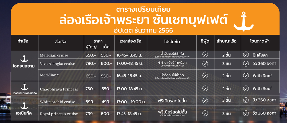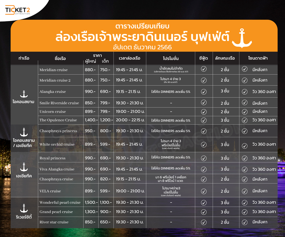 - พิเศษ จองล่องเรือบางกอก เจ้าพระยาครูซ ผ่านเว็บไซต์ Ticket2 ใส่โค้ด DINNER10 ลดเพิ่ม 10%