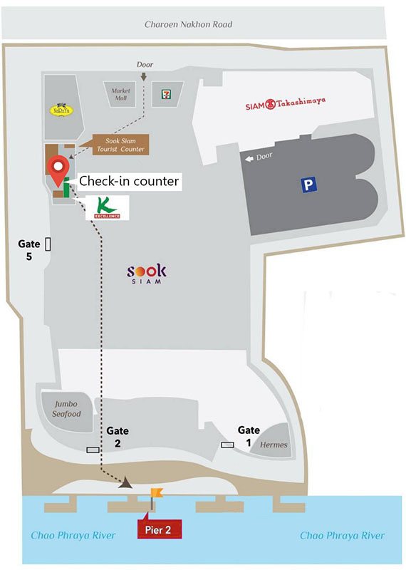 - ล่องตามแม่น้ำเจ้าพระยาขึ้นไปถึงสะพานพระราม 8 ผ่านสถานที่สำคัญของกรุงเทพ เช่น เอเชียทีค โรงแรมโอเรียลเตลและโรงแรม 5 ดาวอื่นๆในบริเวณนั้น วัดอรุณ พระบรมมหาราชวัง วัดโพธิ์ เป็นต้น