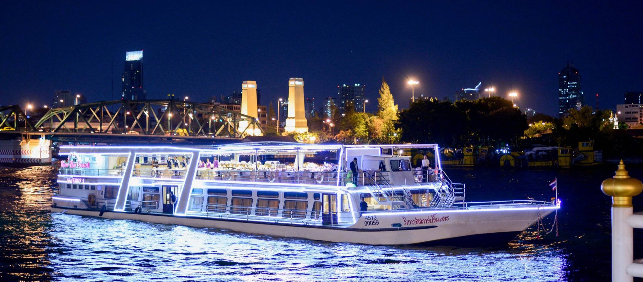 - ล่องเรือเจ้าพระยา พร้อมอาหารค่ำกับเรือริเวอร์ สตาร์ ปริ๊นเซส ครูซ ชมวิวสองฝั่งแม่น้ำเจ้าพระยา ผ่านสถานที่สำคัญต่างๆ เช่น สะพานพระรามแปด พระบรมมหาราชวัง วัดอรุณฯ ไอคอนสยาม เอเชียทีคเดอะริเวอร์ฟร้อนท์