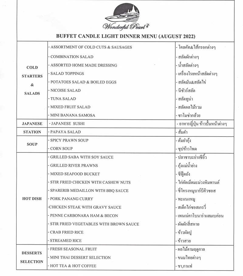 - วันเดอร์ฟูล เพิร์ล เรือสำราญขนาดใหญ่ที่สุดบนแม่น้ำเจ้าพระยา พร้อมสิ่งอำนวยความสะดวกสุดพิเศษ เช่น บันไดเลื่อนและน้ำพุภายในเรือ มอบบรรยากาศหรูหราราวกับยกโรงแรมระดับ 5 ดาวมาไว้บนเรือ โซนดาดฟ้าของเรือเปิดโล่ง ให้คุณเพลิดเพลินกับวิวทิวทัศน์แบบ 360 องศา